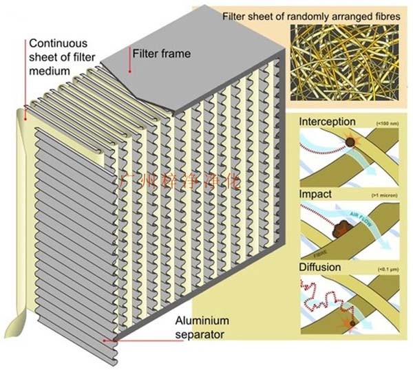 4、纸隔板高效过滤器在腐蚀性环境中,可使用镀乙烯隔板,捕捉0.3μm粒子效率99.99%。