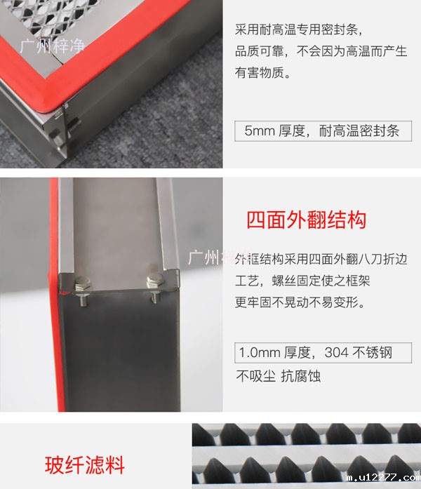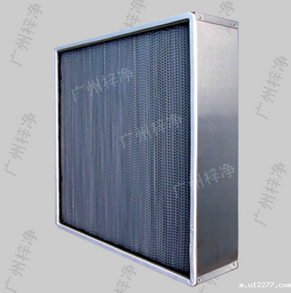 耐高温有隔板高效过滤器产品构成:采用超细玻璃纤维滤纸、铝箔隔板、不锈钢或镀锌外框、特制耐高温密封胶装配而成。过滤器滤材两面180°褶翻,滤料折弯时有两道压痕,使其在隔板的尾端开成盒式褶层,可以防止滤纸破损。