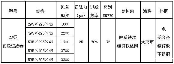 2、G2级初效过滤器轻便的板式结构,优质的聚酯合成纤维过滤材料,初阻力低,防火性好。