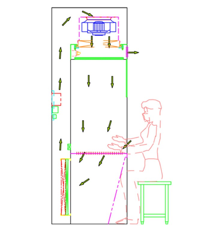 负压称量房设备采用垂直单向流的气流形式,回风先通过初效过滤器进行预过滤,将气流中的大颗粒粉尘粒子处理掉。经过预处理后的空气,再经过高效过滤器进行二次过滤,以起到充分保护高效过滤器的作用。在离心风机提供的压力下,通过高效过滤器,使之达到洁净要求。操作区与外部环境的形成相对负压,从而保证此区域内的粉尘不会扩散至室外,起到保护外部环境的作用。